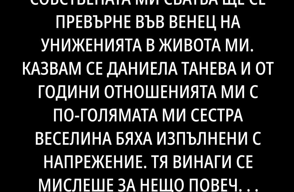 Не съм си и представяла, че собствената ми сватба ще се превърне във венец на униженията в живота ми. Казвам се Даниела Танева и от години отношенията ми с по-голямата ми сестра Веселина бяха изпълнени с напрежение. Тя винаги се мислеше за нещо повече по-хубав дом, съпруг-заможник, престижно положение. Когато ѝ казах, че ще се омъжвам за любимия ми Петър, почти не скриваше презрението си защото той работеше като сервитьор в един скъп ресторант на Цар Освободител в София. Хвърляше обиди от рода на временно, без амбиции, срам за рода. Правех се, че не ги чувам, защото знаех кой е Петър.