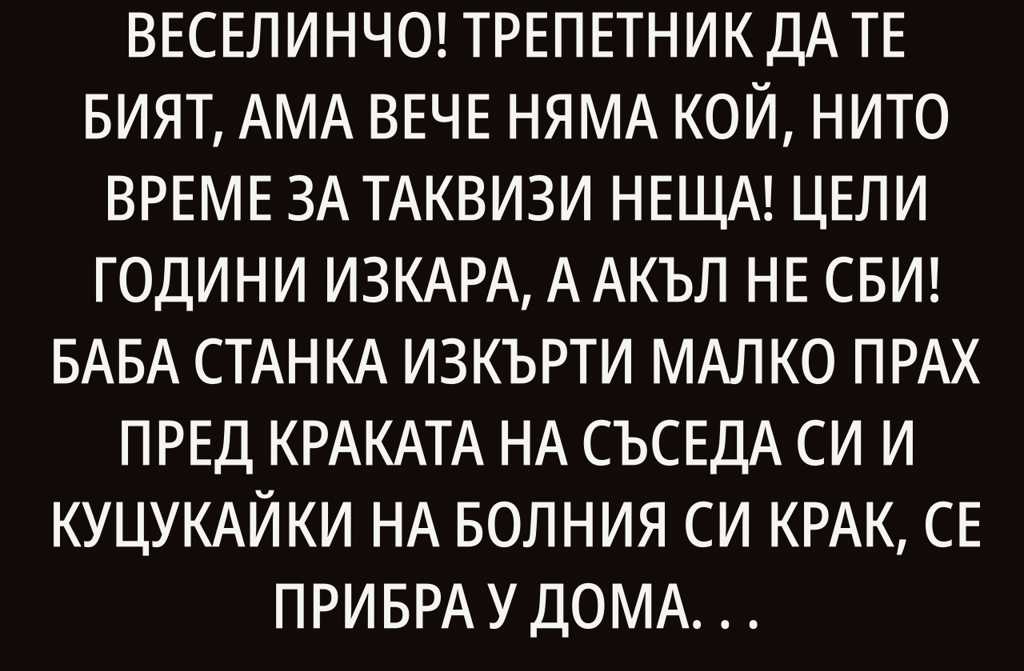– Голям си ми фантазьор, бре, Веселинчо! Трепетник да те бият, ама вече няма кой, нито време за таквизи неща! Цели години изкара, а акъл не сби!