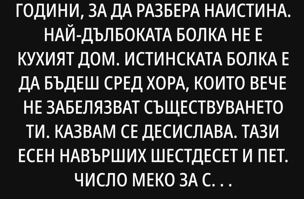 Казвам се Десислава. Тази есен навърших шестдесет и пет.