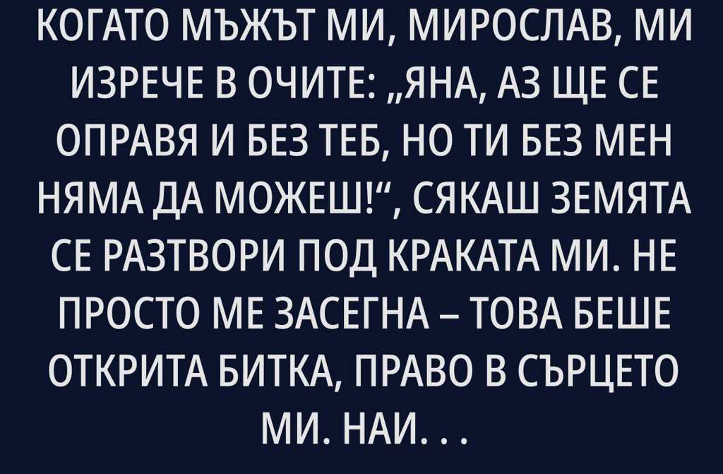 Когато мъжът ми, Мирослав, ми изрече в очите: Яна, аз ще се оправя и без теб, но ти без мен няма да можеш!, сякаш земята се разтвори под краката ми. Не просто ме засегна това беше открита битка, право в сърцето ми. Наистина ли вярва, че съм слаба, зависима от него и че без него животът ми ще се разпадне? Е, добре тогава! Още същия ден реших край на това да бъда просто негова сянка. Започнах работа на половин ден, за да поставя основите на собствения си живот без неговата загриженост. Искам да разбере, че не просто оцелявам, а се превръщам в нещо много повече, отколкото някога е подозирал.