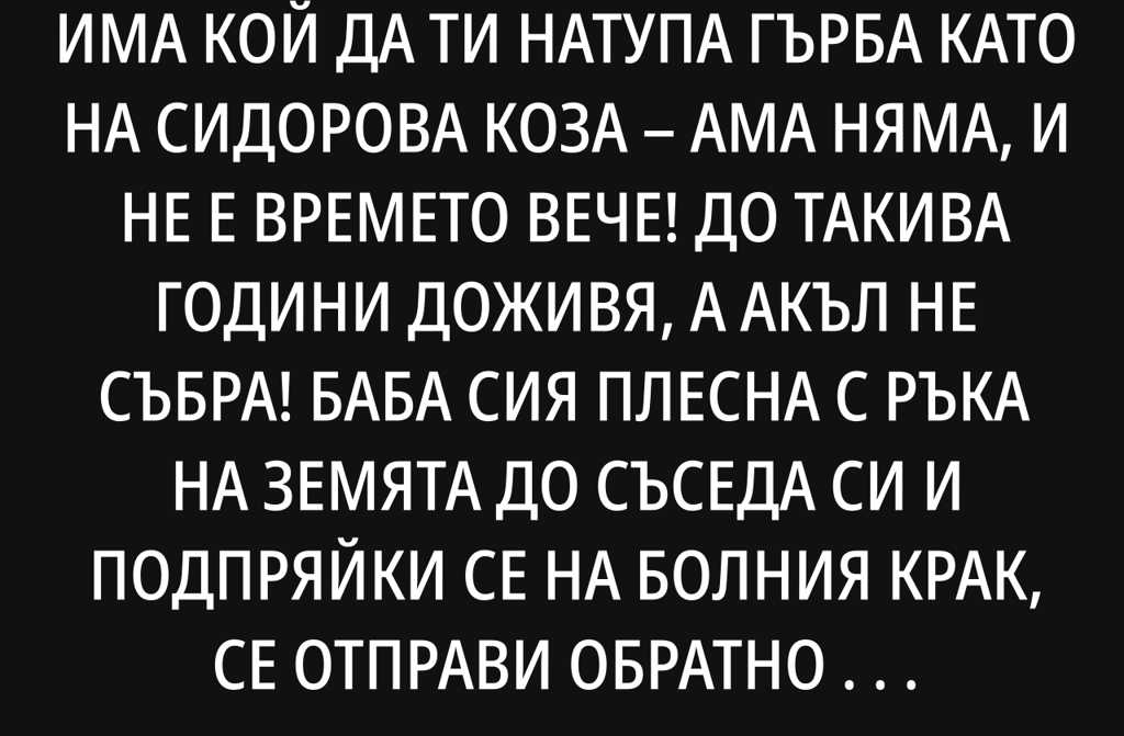 Баба Сия плесна с ръка на земята до съседа си и подпряйки се на болния крак, се отправи обратно към къщи. Свърши си работата, а оттук нататък съвестта му да решава как ще живее. Хората не му дадоха ум, може съдбата да се намеси?