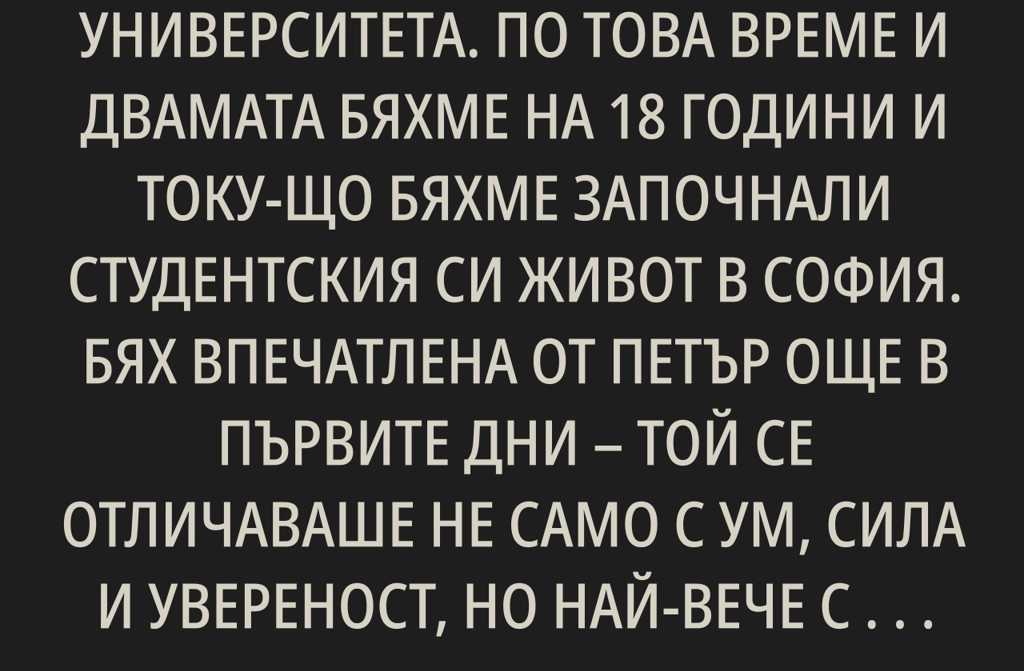 Запознах се със съпруга си в университета. По това време и двамата бяхме на 18 години и току-що бяхме започнали студентския си живот в София. Бях впечатлена от Петър още в първите дни той се отличаваше не само с ум, сила и увереност, но най-вече с добротата си, която лъхаше от всяка негова дума и жест. Отначало бяхме само приятели, но с времето си дадох сметка, че чувствата ми към него са далеч по-дълбоки. След няколко месеца станахме двойка. И до днес си спомням с топлина за този период годините в университета бяха най-хубавите в живота ми.