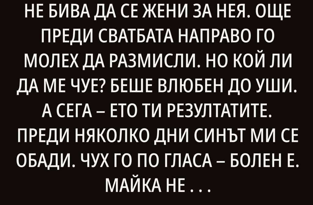 Колко пъти съм му казвала, че не бива да се жени за нея. Още преди сватбата направо го молех да размисли. Но кой ли да ме чуе? Беше влюбен до уши. А сега ето ти резултатите.