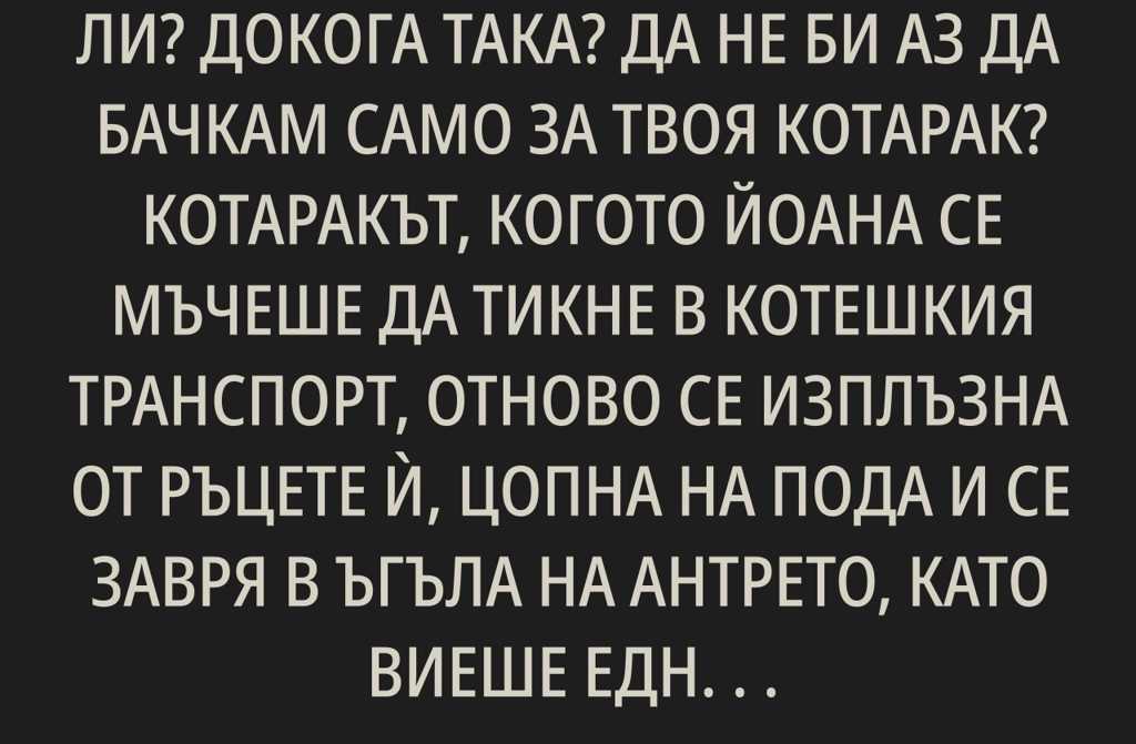 Котаракът, когото Йоана се мъчеше да тикне в котешкия транспорт, отново се изплъзна от ръцете ѝ, цопна на пода и се завря в ъгъла на антрето, като виеше едновременно трагично и зловещо. По вида му можеше спокойно да решиш, че Котаракът, на когото Йоана някога с голяма романтика даде името Боян, се кани да продаде живота си възможно най-скъпо.