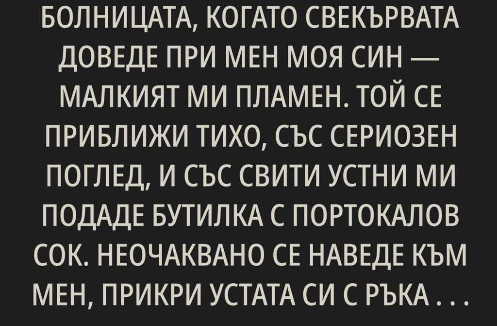 След катастрофата лежах в болницата, когато свекървата доведе при мен моя син малкият ми Пламен. Той се приближи тихо, със сериозен поглед, и със свити устни ми подаде бутилка с портокалов сок. Неочаквано се наведе към мен, прикри устата си с ръка и прошепна: Баба каза да пиеш това, но ме помоли да не казвам нищо друго.