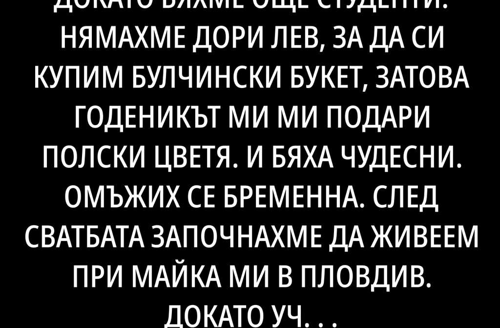 Влюбихме се един в друг, докато бяхме още студенти. Нямахме дори лев, за да си купим булчински букет, затова годеникът ми ми подари полски цветя. И бяха чудесни. Омъжих се бременна. След сватбата започнахме да живеем при майка ми в Пловдив. Докато учех, майка ми ни помагаше във всичко. В началото с мъжа ми живеехме прекрасно. Излизахме заедно, отглеждахме сина си. Съпругът ми ми помагаше много с детето. Заедно ставахме да видим как спи синът ни. Той се стараеше да изкарва пари по всякакъв начин.