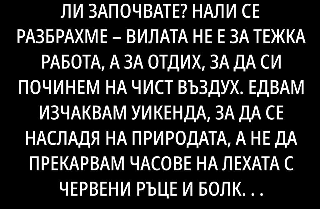 Ох, Десислава Георгиева, пак ли започвате? Нали се разбрахме вилата не е за тежка работа, а за отдих, за да си починем на чист въздух. Едвам изчаквам уикенда, за да се насладя на природата, а не да прекарвам часове на лехата с червени ръце и болки в кръста. А и пък още ми е пресен маникюра.