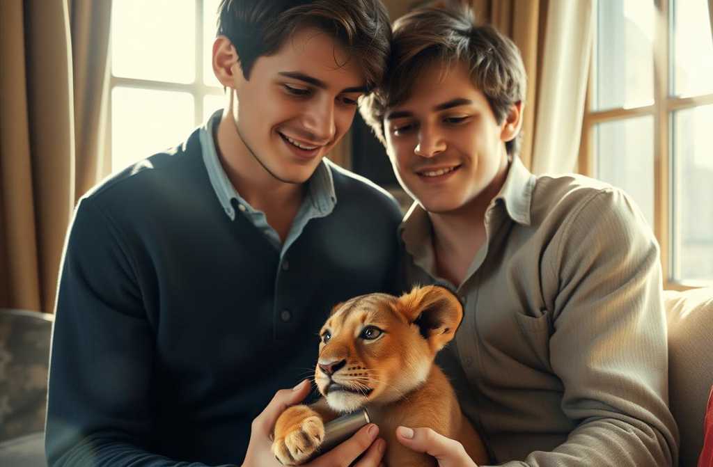 Един ден, разхождайки се по улиците, попаднаха на дребен зоомагазин с екзотични животни. От витрината ги гледаха птици, маймуни и влечуги, но погледът им беше прикован към малка клетка, в която лежеше лъвче. Животното беше едва по-голямо от котенце, с огромни тъжни очи, които сякаш разбираха всичко около него.