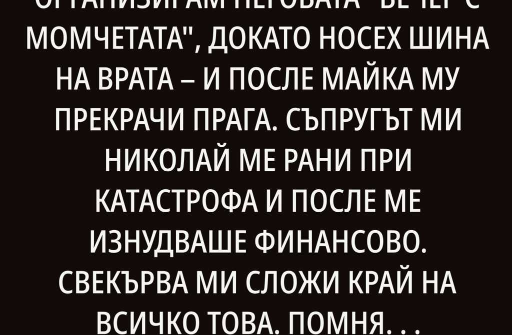 Помня, че бях млада майка на 33 години. Носех вратна шина, защото Николай, тогава на 34, не можа да се удържи да не разглежда Инстаграм, докато чакахме на светофара. След като се стигна до инцидента, започна да ме заплашва, че ще ми спре достъпа до парите, докато се възстановявах. Чувствах се заклещена, докато един роднина не се намеси.