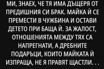 Нямаше изневяра, нямаше скрити съобщения по Вайбър, някаква жена от службата нищо такова. Просто един ден усетих, че Косьо вече не ме гледа по начина, по който ме гледаше едно време. Заговорите ни станаха по-скоро списък със задачи купих ли хляб, кога трябва да платим тока, в колко да тръгнем утре. Вече не ме питаше как съм, аз също рядко му разказвах за себе си. Ако споделях нещо, често ме слушаше докато превърта каналите или цъка на телефона си. Започнахме все по-често просто да мълчим.