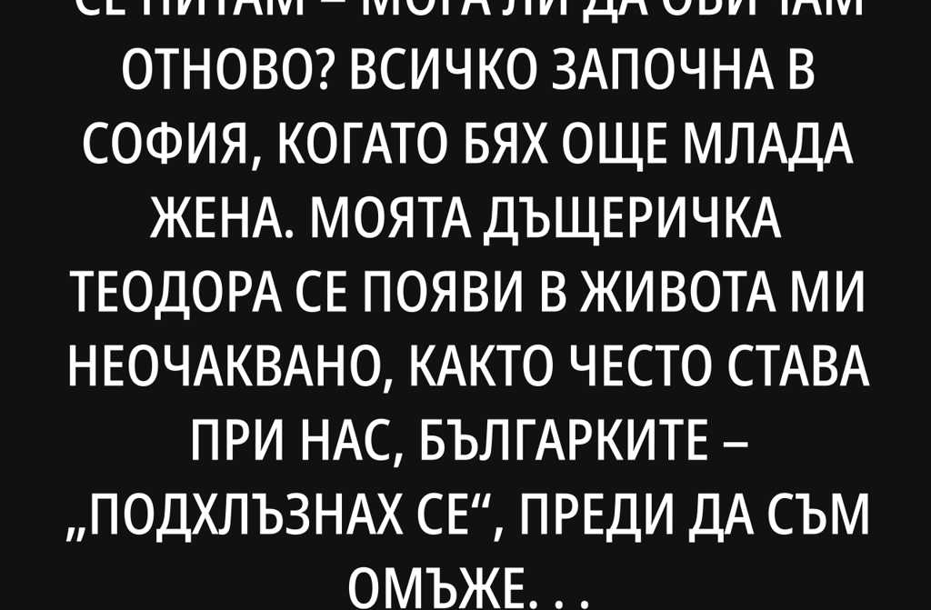Цял живот се питам мога ли да обичам отново? Всичко започна в София, когато бях още млада жена. Моята дъщеричка Теодора се появи в живота ми неочаквано, както често става при нас, българките подхлъзнах се, преди да съм омъжена, както казват нашите баби. Поглеждам назад и се усмихвам на наивността си. Имаше един ухажор красив като артист и с добри маниери, но ни за какво не се задържаше. Никога не заговори за брак. Разхождах го гордо под лакът покрай съседките, седящи като слънчогледи на пейките пред входа, устремени към поредната драма в махалата. Печалното бе, че младежът бе безработен и по-скоро леконог бръмбар, отколкото надежден мъж. Аз готвех, хранех го, грижих се за всичко и бях готова да се разпростра като шарено чердже по пътя му.