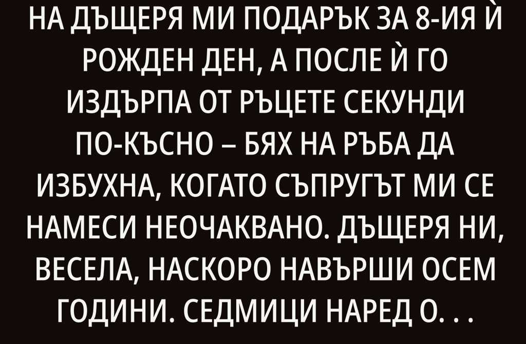 Затова когато свекърва ми, Стоянка, пристигна с огромна пъстра торба и с гръмко обяви, че носи нещо много специално, изобщо не се притесних. Стоянка нарочно привлече вниманието и постави подаръка пред Весела. Хайде, злато, отвори подаръка от баба, рече тя с онази нейна усмивка, в която няма живот.