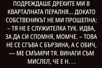 Ето го! вдигна Нина Петрова ръце към тялото си. Аз съм като майка! Дойдох да помагам! А вие ме гоните? Аз, между другото, не измервах кръвното, а вече се захващам с кърпа. Бихте могли да кажете благодарност.