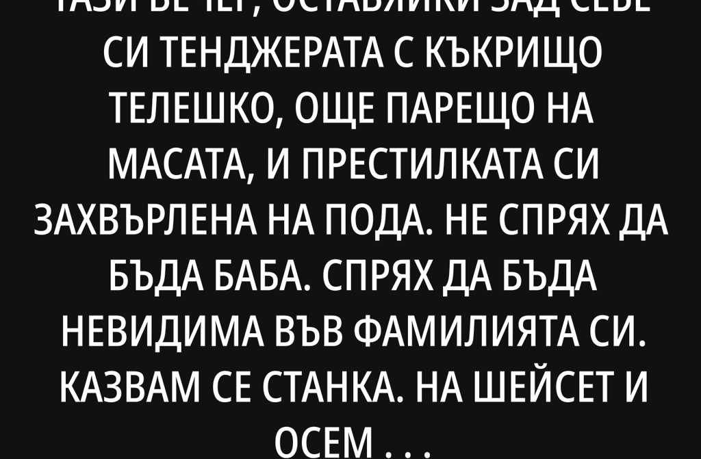 Казвам се Станка. На шейсет и осем години съм, и през последните три години кротко въртя домакинството на сина ми Костадин без заплата, без похвали, без спиране. Аз съм селото, за което хората толкова обичат да разказват, ала в днешните времена старейшините на селото са длъжни тихомълком да носят товара и да не протестират.