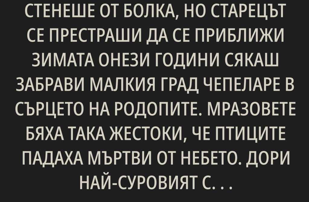Зимата онези години сякаш забрави малкия град Чепеларе в сърцето на Родопите. Мразовете бяха така жестоки, че птиците падаха мъртви от небето. Дори най-суровият стопанин не би изгонил кучето си на такъв студ, но точно по време на най-страшната виелица старият ловец Христо, когото всички познаваха като Белобрадия, навлезе в дълбоката гора. Не го пускаше тревожно чувство, лепнещо по мислите му като невидим сняг.