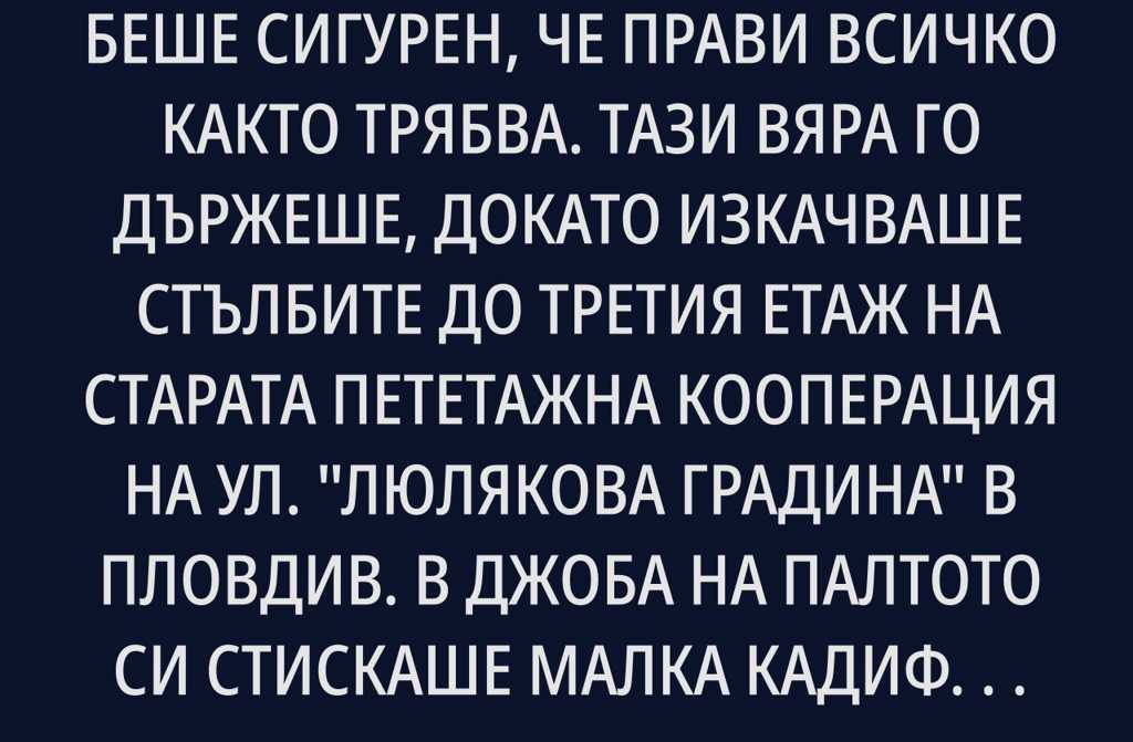 Той беше сигурен, че прави всичко както трябва. Тази вяра го държеше, докато изкачваше стълбите до третия етаж на старата пететажна кооперация на ул. “Люлякова градина” в Пловдив. В джоба на палтото си стискаше малка кадифена кутийка от бижутерия Сапфир, и все я докосваше с пръсти, сякаш да се увери, че още е там. Пръстенът струваше сериозно беше избирал почти час, докато продавачката му носеше поднос след поднос, а той само гледаше, преценяваше, мислеше си как Екатерина ще се зарадва. Та трябваше да се зарадва. Десет години не са малко.