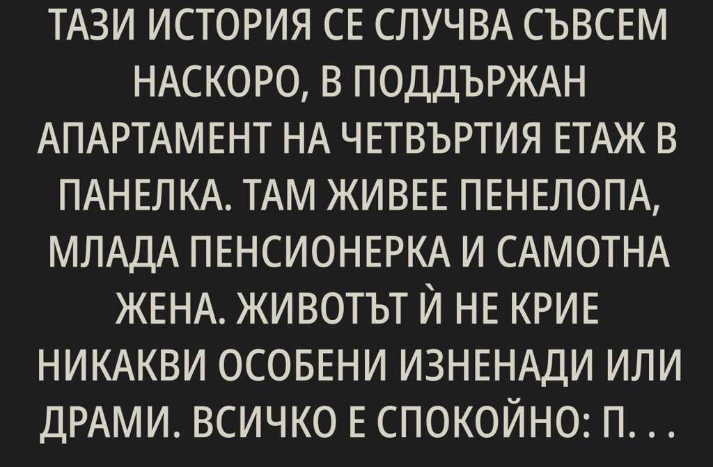 Тази история се случва съвсем наскоро, в поддържан апартамент на четвъртия етаж в панелка. Там живее Пенелопа, млада пенсионерка и самотна жена.
