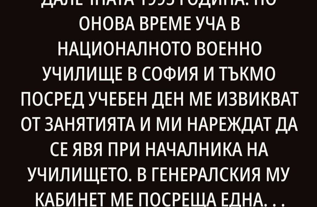 Този случай се случва през далечната 1995 година. По онова време уча в Националното военно училище в София и тъкмо посред учебен ден ме извикват от занятията и ми нареждат да се явя при началника на училището. В генералския му кабинет ме посреща една жена. Личи си, че е силно разстроена по бузите ѝ се стичат сълзи, които тя несръчно попива с носна кърпичка.