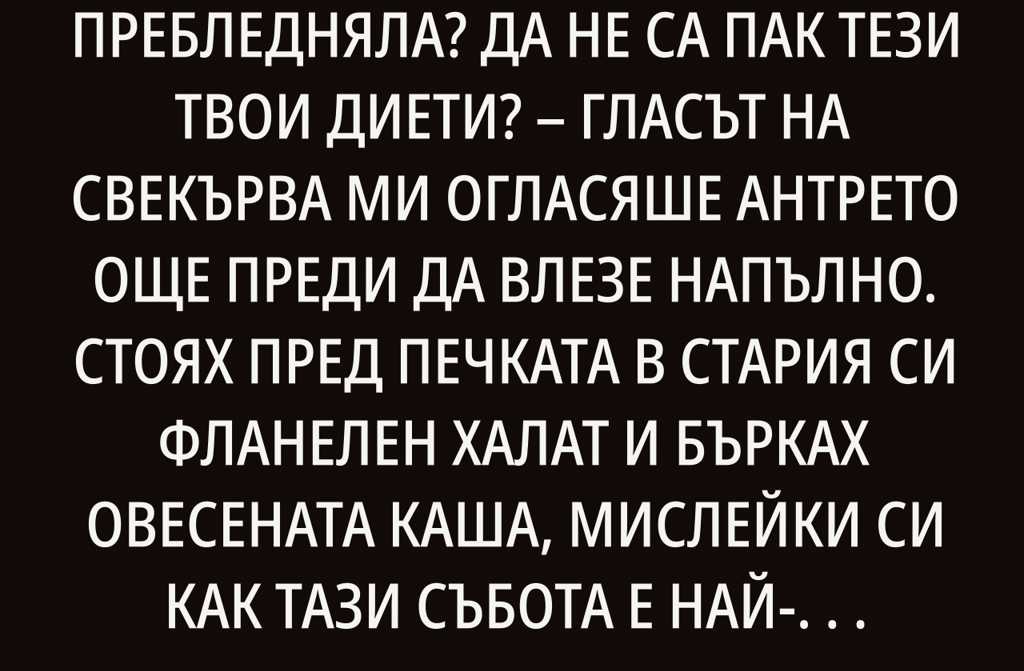 Обърнах се. Пенка Димитрова, свекърва ми, вече пристъпваше в кухнята, докато събличаше сакото си, което повеси небрежно на облегалката на стола, без да гледа. Сакото се свлече на пода. Тя дори не го забеляза.