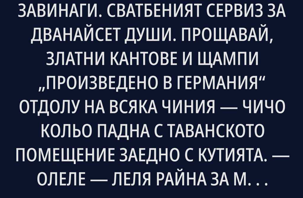 У леля Райна се счупи целият сервиз. Завинаги. Сватбен сервиз за дванадесет души. Сбогом, златни кантове и печати “Made in Germany” на дъното на всяка чиния — чичо Кольо падна от гардероба с кутията. — Оле, — леля Рая дори се заинтригува. — Нали е порцеланов! Все едно порцеланът не се троши. После осъзна трагедията — полегна в креслото: „Николай, донеси валидола!“, звъня на всички, дори на мен, макар да сме на междуселищен разговор, и оплакваше младостта си, разпиляна на хиляди парченца: — Родителите ни го подариха преди двайсет години. Не сме го изваждали, чакахме специален случай, порцеланова, боже прости, сватба. И какво? Татко почина, на Кольо изкълчен глезен, на мен кръвното ми е високо. И никой, забележи, нито веднъж не хапна от тези чинии. Будали! Замислих се. Защо пазим сервизите, бижутата и хубавите емоции за “специален повод”? Защо съхраняваме ароматните свещи за “особена нощ”, крием диамантени обеци в кутия, пляскаме по ръчичката, ако детето дръпне наденицата “преждевременно”, и стискаме нежни думи за Свети Валентин? Защо този ден, този миг, да е по-лош от очаквания? Сигурни ли сме, че “ще има време”? Почти всички обаждания от горящите кули-близнаци в Ню Йорк бяха признания в любов. Хората звъняха на близките си, оставяха съобщения на телефонни секретари. „Аз. Те. Обичам.” — това се оказа най-важното, което трябва да успееш да кажеш на този свят. Реалността, ако вярваме на енциклопедиите, е “съществуващото в действителността”, онзи миг между миналото и бъдещето. Не бива да отлагаме за след време, да скътваме на гардероба, да прятаме “за някога” онова, което тук и сега може да донесе радост, удоволствие и усмивка. Утре няма. Има само днес, което е не по-малко уникално от 31 декември или някоя си там Баба Марта. Така че да побързаме — да се сдобрим, да видим морето, да поиграем с момчето, да прегърнем дъщерята, да подарим на мама още един “Шанел № 5” — за да го носи не само на празник, а всеки ден. Да успеем — да прочетем, да опитаме супа от морски таралеж или печена скакалец, да гледаме любимия филм и да забравим за мръсните чинии в мивката. Да купим на леля Рая нов сервиз и да спретнем велик празник. Да побързаме да кажем “Обичам те” — преди да тръгнат финалните надписи.