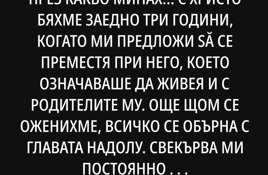 Виж, приятелко, ще ти разкажа през какво минах С Христо бяхме заедно три години, когато ми предложи să се преместя при него, което означаваше да живея и с родителите му. Още щом се оженихме, всичко се обърна с главата надолу.