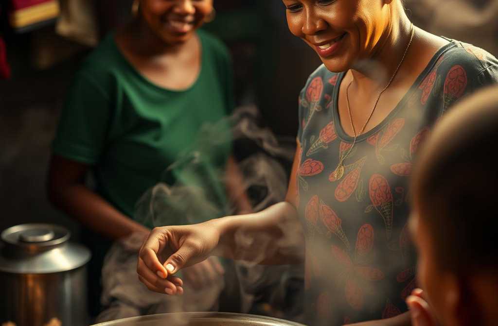 Тя влезе в залата, носеща огромната си димяща кана, изпълвайки въздуха с аромата на боб и подправки.