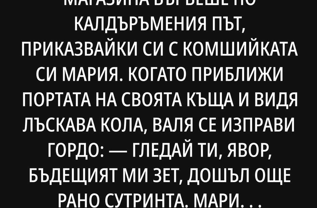 Валя с тежките торби от магазина вървеше по калдъръмения път, приказвайки си с комшийката си Мария. Когато приближи портата на своята къща и видя лъскава кола, Валя се изправи гордо: