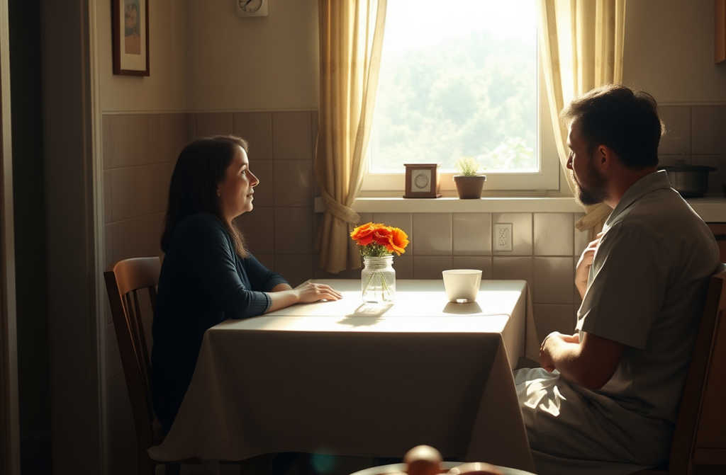 Иван намалява водата. Валя го поглежда отчаяно, после спира напълно чешмата, подсушава ръцете си и сяда на масата.