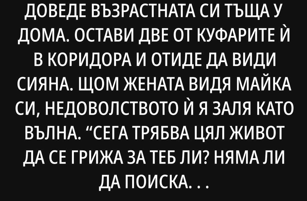 Беше вече късен следобед. Зетят доведе възрастната си тъща у дома. Остави две от куфарите ѝ в коридора и отиде да види Сияна. Щом жената видя майка си, недоволството ѝ я заля като вълна. Сега трябва цял живот да се грижа за теб ли? Няма ли да поискаш да се върнеш пак натам, в селото си?