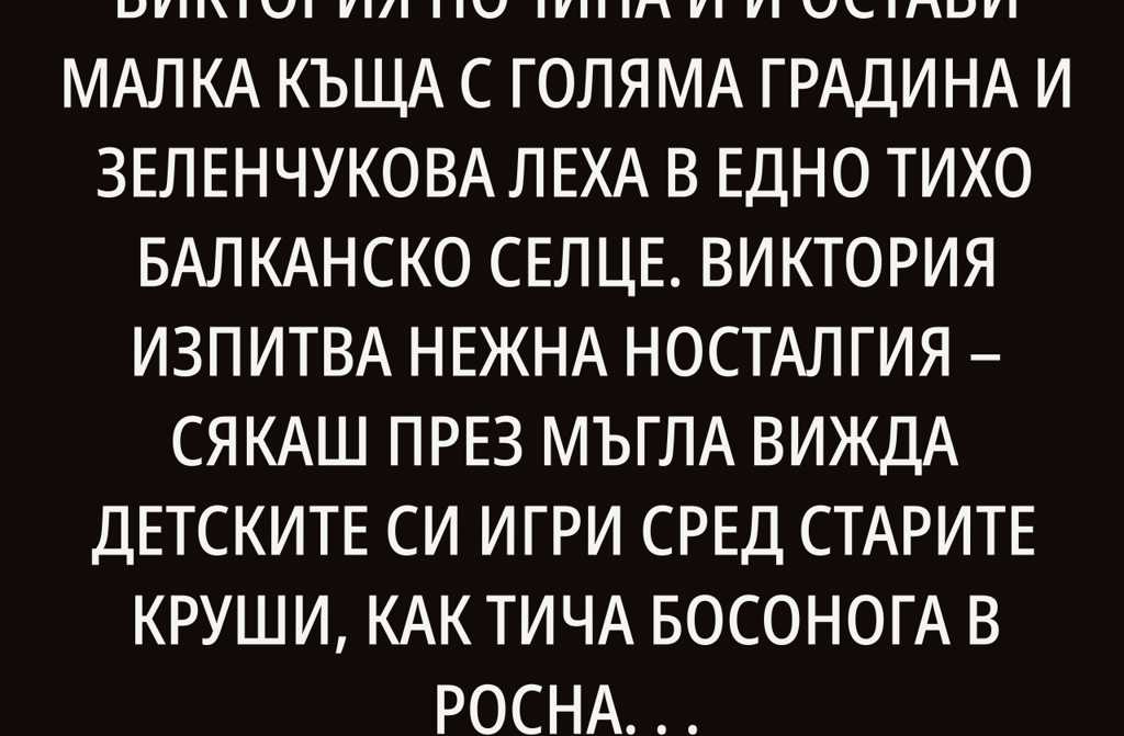 Преди две години бабата на Виктория почина и ѝ остави малка къща с голяма градина и зеленчукова леха в едно тихо балканско селце. Виктория изпитва нежна носталгия сякаш през мъгла вижда детските си игри сред старите круши, как тича босонога в росната трева и как помага на баба си да подрежда зимнина. Всяка събота, подобно на разлята мелодия, се връщаше там с цялото семейство и със свекърва си, за да вдишат тънкия въздух на планината и да вкусят узрели малини и череши, напук на забравата. Отношенията ѝ със свекърва ѝ бяха толкова спокойни, че сякаш никога не е имало дори сянка на спор.