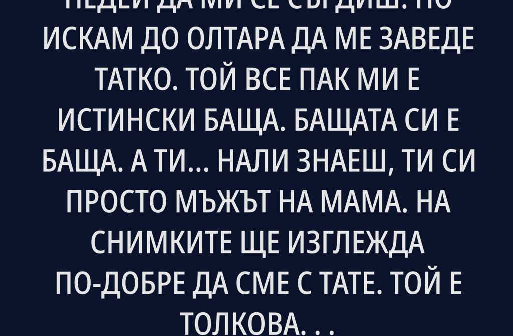Виктор, моля те, недей да ми се сърдиш. Но искам до олтара да ме заведе татко. Той все пак ми е истински баща. Бащата си е баща. А ти… нали знаеш, ти си просто мъжът на мама. На снимките ще изглежда по-добре да сме с тате. Той е толкова представителен в костюм…