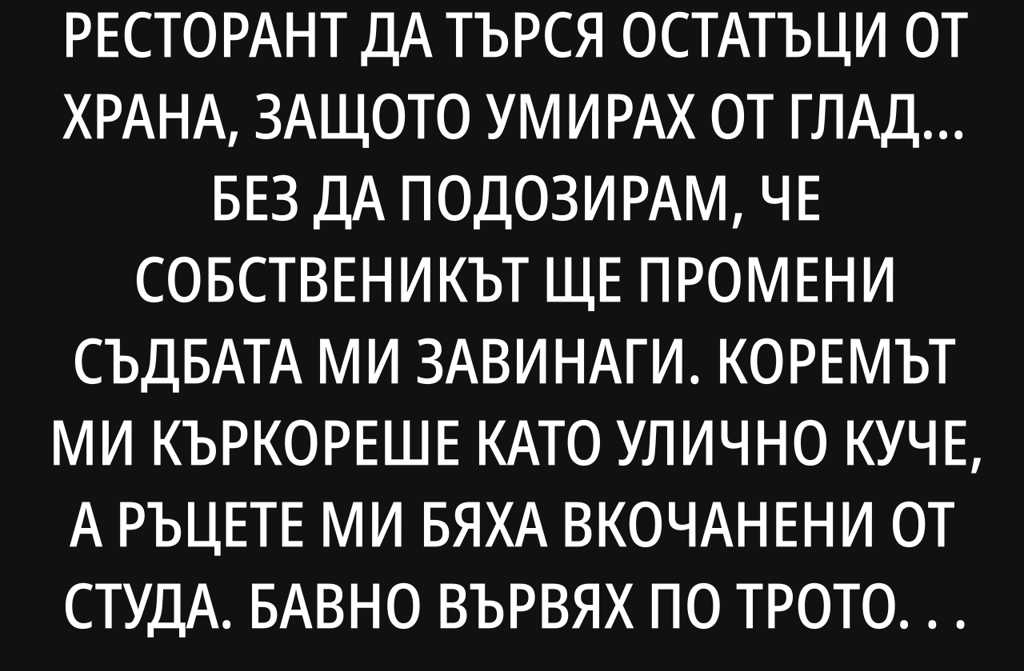 Влязох в един софийски ресторант да търся остатъци от храна, защото умирах от глад… без да подозирам, че собственикът ще промени съдбата ми завинаги.