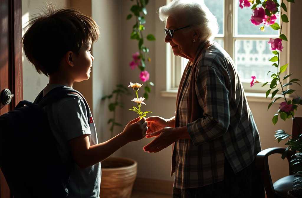 Добър ден, бабо Стефано казваше той, оставяйки раницата си на стол. Ето ви любимото ви цвете.