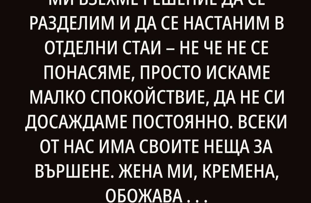 Жена ми, Кремена, обожава да слуша музика силно, категорично отказва да си сложи слушалки. Аз пък, предпочитам тишината, обичам да чета книги спокойно или да се загледам в някой сериал. Понякога ми се налага да работя от вкъщи и да говоря по телефона с клиенти, което на свой ред я дразни. Така че решихме живеем си в отделни стаи. Апартаментът ни има две стаи, и двете обзаведени по наш вкус. Искам да ти разкажа какво е да живееш разделено, но заедно.