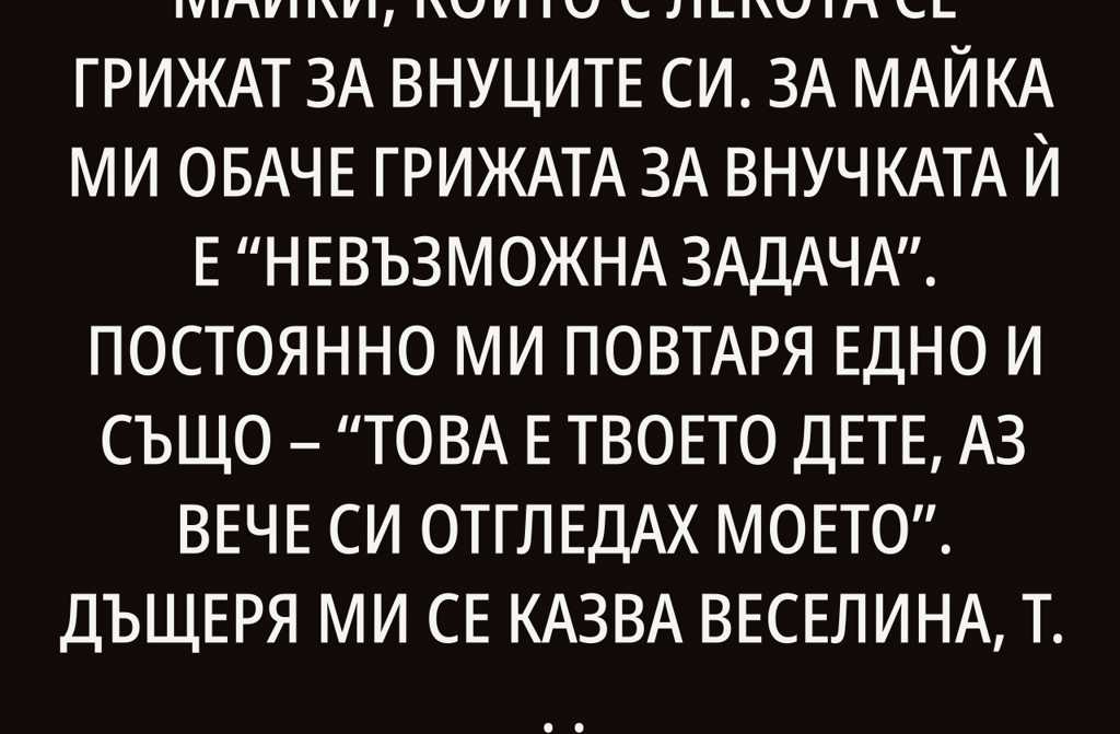 Всички мои приятелки имат майки, които с лекота се грижат за внуците си. За майка ми обаче грижата за внучката ѝ е невъзможна задача. Постоянно ми повтаря едно и също това е твоето дете, аз вече си отгледах моето. Дъщеря ми се казва Веселина, тя е на 5 години и ходи на детска градина. Преди две години, след майчинството, трябваше да се върна на работа работя като начален учител и, за съжаление, не мога често да си взимам почивни дни. В такива моменти много би ми помогнало, ако майка ми можеше да е наблизо.