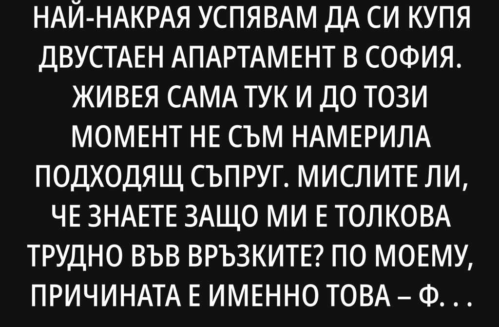 На тридесетия си рожден ден най-накрая успявам да си купя двустаен апартамент в София. Живея самa тук и до този момент не съм намерила подходящ съпруг. Мислите ли, че знаете защо ми е толкова трудно във връзките? По моему, причината е именно това фактът, че притежавам собствено жилище. Днес за една жена е истинско изпитание да бъде едновременно независима и запази женствеността си. Всички ухажори, които срещам, мога да разделя само на две групи: