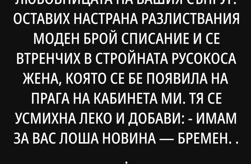 – Имам за вас лоша новина бременна съм. Естествено, от вашия съпруг.