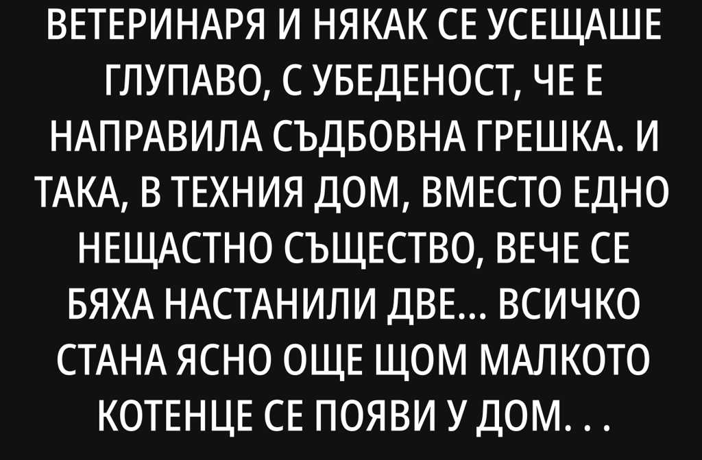 Жена водеше кучето си при ветеринаря и някак се усещаше глупаво, с убеденост, че е направила съдбовна грешка. И така, в техния дом, вместо едно нещастно същество, вече се бяха настанили две…