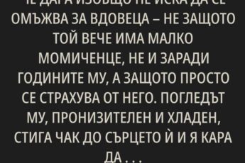 Увери ме, че съвсем скоро ще изкарва пари от знанията си ще консултира хора, ще прави сеанси, ще води някакви онлайн курсове. Минаваха дни, а единственият му курс беше от спалнята до хладилника. Станах негова енергийна коректорка поправя ме във всичко: как мисля, как се държа, даже как се прозявам. Ако въздъхна, че съм изморена, казва, че съм на ниска честота. Ако съм кисела, значи емоциите ми са блокирани.