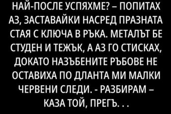 Първите дни се държах като жената на годината. Разбиране, прегръдки, чай от липа… Каза ми, че му трябвало време да открие вътрешния си глас и че го е изтощила системата менте. Аз естествено си продължих с работата. Всеки ден ставам в 6, навличам палтото и тичам към спирката, а вечер се прибирам изстискана като последното кисело мляко в магазина. Той обаче стои у дома, гледа клипове за личностно израстване, пали билкови връвчици и медитира поне така твърди. Нарича го лечение.