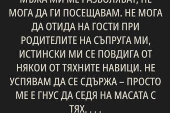 Поначало си мислех, че просто е твърде строга и иска контрол. От онези български майки, дето винаги се месят, винаги имат мнение. Опитвах се да съм приятна. Да бъда възпитана. Да поемам наболялото и да мълча. Успокоявах се: тя е майка му, време трябваще ме приеме