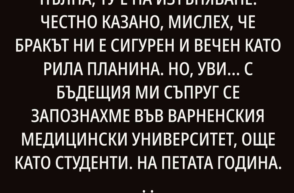С бъдещия ми съпруг се запознахме във Варненския медицински университет, още като студенти. На петата година сключихме брак. Свекърва ми като сватбен подарък ни подари екскурзия до Белград и ни връчи ключовете на тристаен апартамент в Люлин. А това беше само началото.